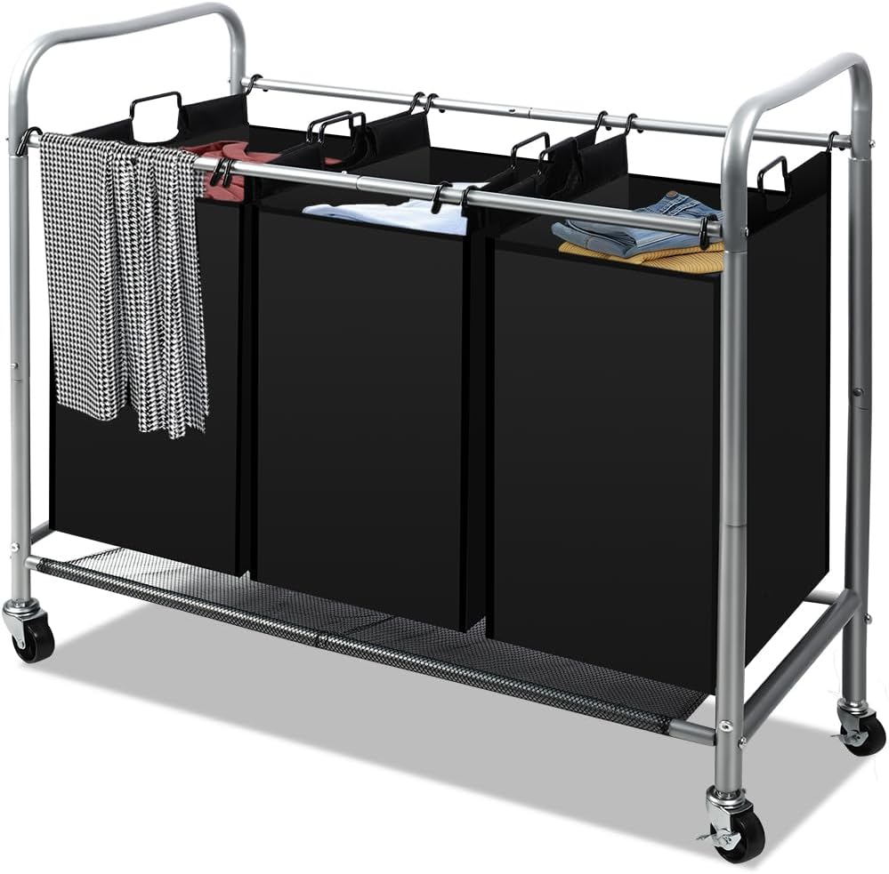 3 Sacos de Cesto de Roupa Suja, Cesto de Roupa Suja com Divisoria, 3 Bag Laundry Hamper Carrinho com Rodas Bloqueáveis de Rolamento Resistente E Sacos Removíveis
