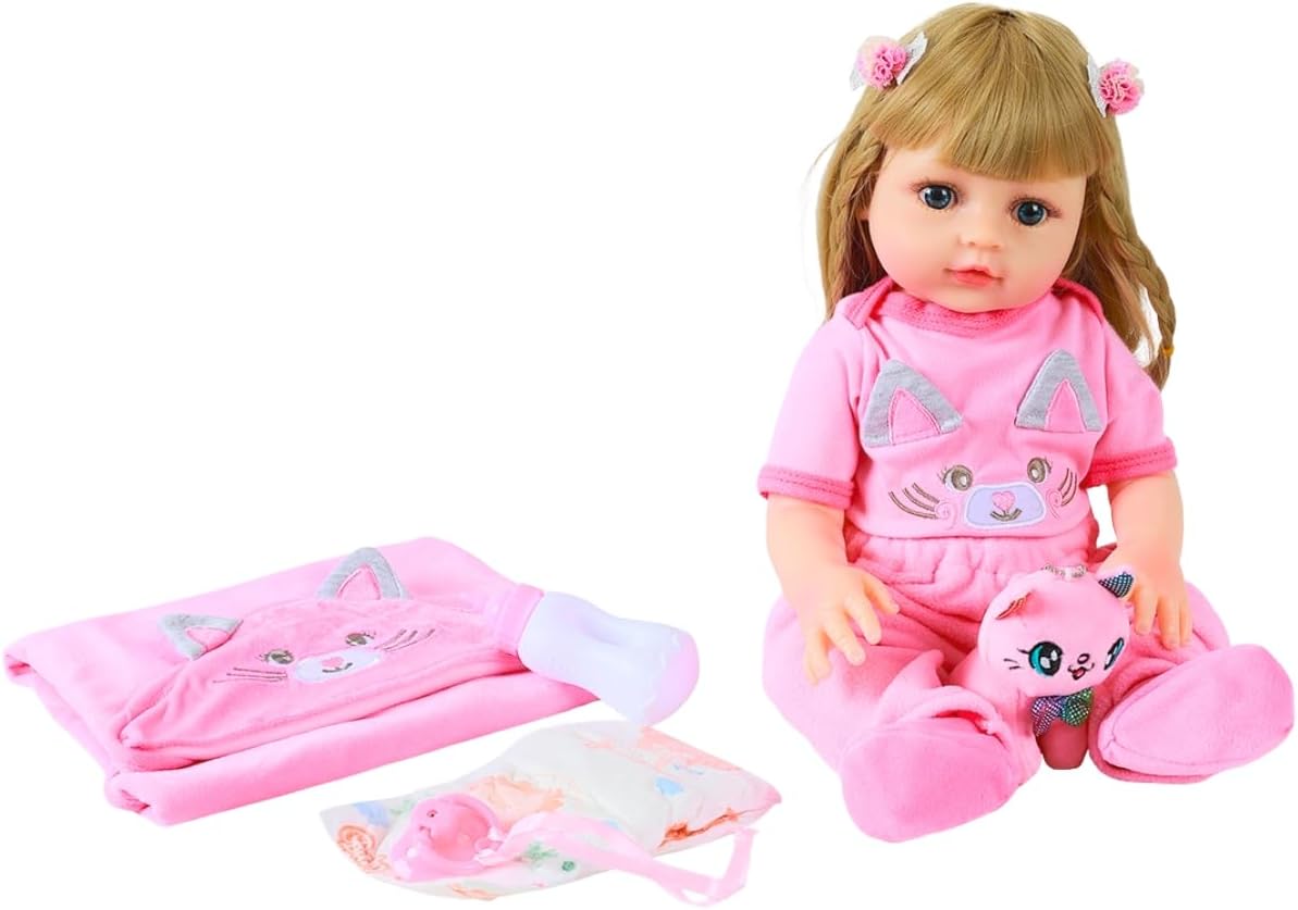 Acessórios incluídos: Chupeta, Mamadeira, Fraldas, Brinquedo de pelúcia (Gatinho), Certidão de nascimento e Elástico de cabelo