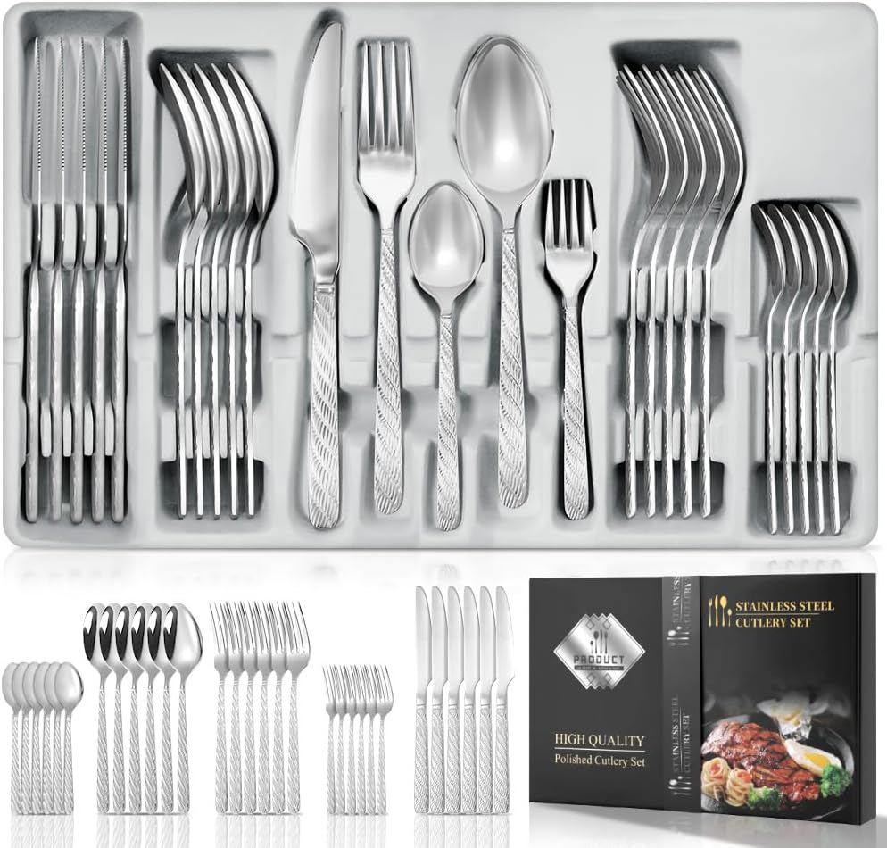◖CONJUNTO DE 6◗ Esse conjunto de talheres de aço inoxidável de 30 peças inclui 6 facas de jantar, 6 colheres de sopa, 6 colheres de chá, 6 garfos de salada e 6 garfos de jantar, fornecendo tudo o que você precisa para uma configuração completa da mesa.