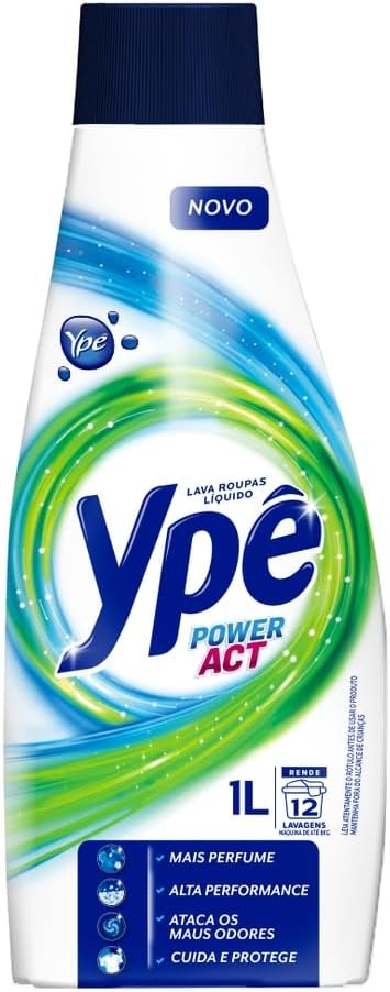 O Lava Roupas Ypê Power Act 1l possui fórmula exclusiva com a mais alta concentração de ativos de limpeza do mercado, sendo o único com Oxigênio Ativo, o mesmo ingrediente dos Tira-Manchas. A versão 1l rende 12 lavagens.